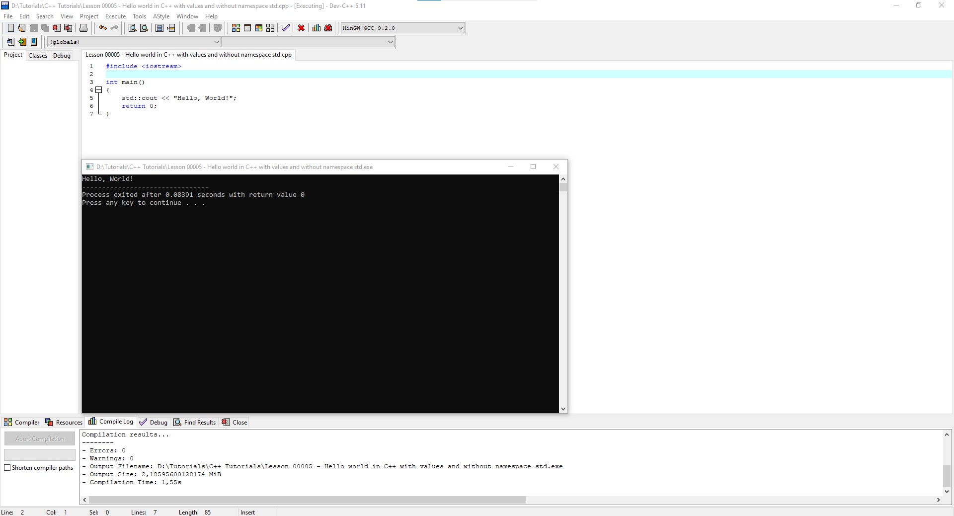 > C++ 17 Hello world with values and without namespace std