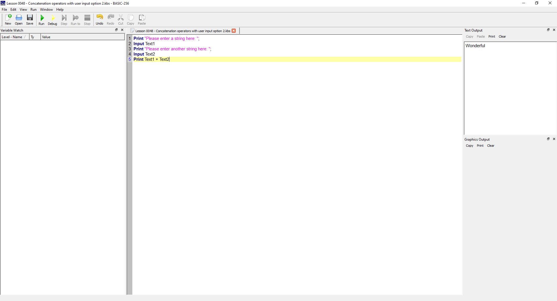 | Guest | 11 hours ago | Viewing Attachment in Thread Basic-256 Concatenation Operators with user input option 2 |